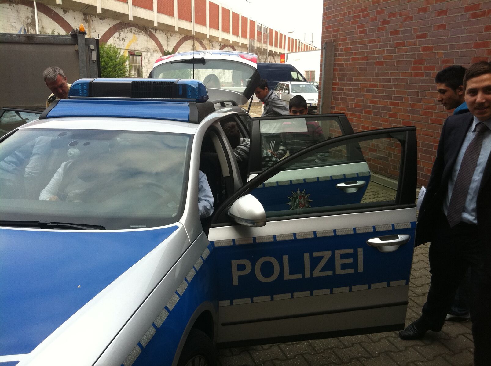 Im Außenbereich stand ein Streifenwagen bereit, der von den Besuchern genau inspiziert wurde. Nachdem sich die Jugendlichen auch mit einem Polizeimotorrad und allgemeiner Schutzkleidung vertraut machten, endete der Besuch im Konferenzraum der Polizei. Dort bot sich die Möglichkeit, Rückfragen zu stellen. Das Interesse am Polizeiberuf schien geweckt, die Begeisterung war deutlich zu spüren. Voraussetzungen für den Beruf sind die deutsche Staatsbürgerschaft, auch eine weitere ist möglich, und gute sprachliche sowie körperliche Fähigkeiten. Ein Beispiel dafür ist ein türkischstämmiger Mitarbeiter, der seinen Kollegen in Ehrenfeld durch den gekonnten Umgang mit anderen türkischstämmigen Bewohnern des Stadtteils eine große Hilfe ist.
